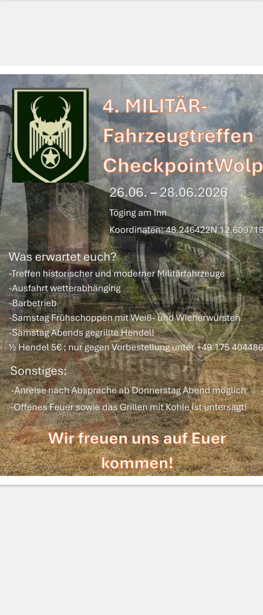 | Treffen Franz Wolfmayr (Neufelden) | 24. bis 26. Juli 2026 | Franz Wolfmayr (+43 664 / 4614235) | Militärfahrzeugtreffen 2026 |